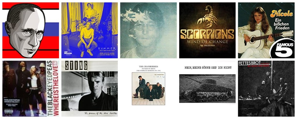 Eins der wohl bekanntesten deutschen Friedenslieder ist „Ein bisschen Frieden“ von Nicole, mit dem sie vor 40 Jahren den Eurovision Song Contest gewonnen hat und mit dem sie auch heutzutage mit Sicherheit wieder den Nerv der Zeit treffen würde.